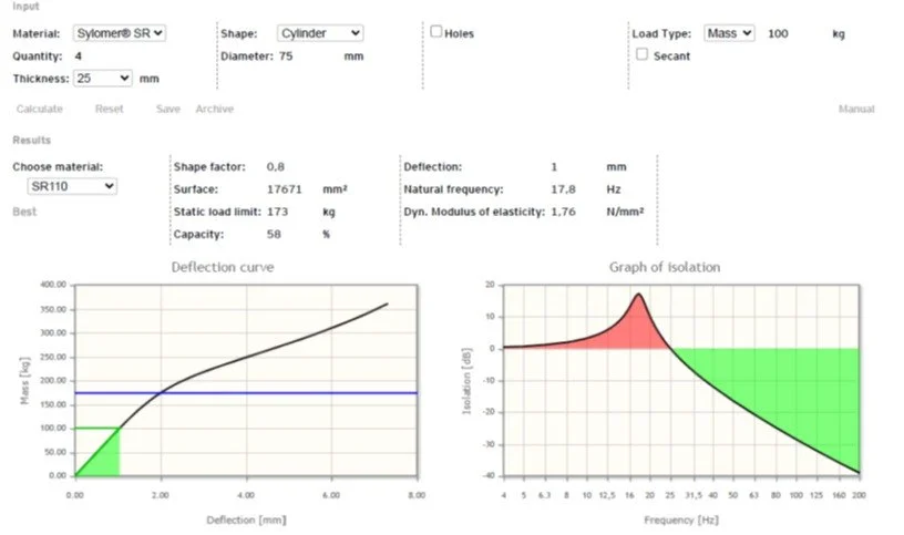 A correctly loaded isolator must be deflected the correct amount, often about 10% of original height. It is important that the shape does not unduly change and that the isolator material does not harden over time - which rubber does. Sylomer from Getzner is a good example of a suitable vibration isolator as it can be loaded/deflected properly, it maintains it’s shape and doesn’t harden significantly over time.